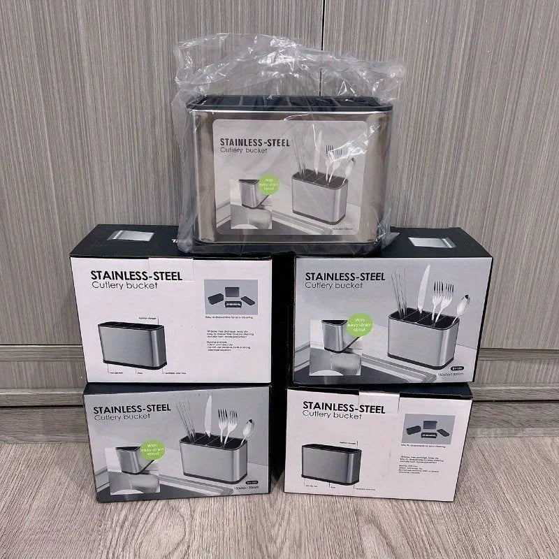 1. Sleek and stylish, this Premium Stainless Steel Utensil Organizer is the perfect addition to any kitchen countertop or cabinet. With its durable barrel design and anti-slip drip tray, it is a versatile storage solution for everyday use.